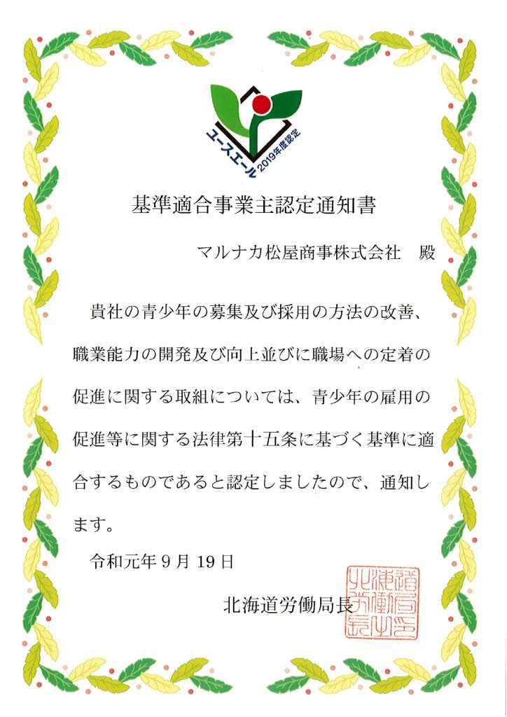 雇用管理の基準を満たす中小企業を対象にした厚生労働省の「ユースエール認定企業」に今年度も弊社が選ばれました。